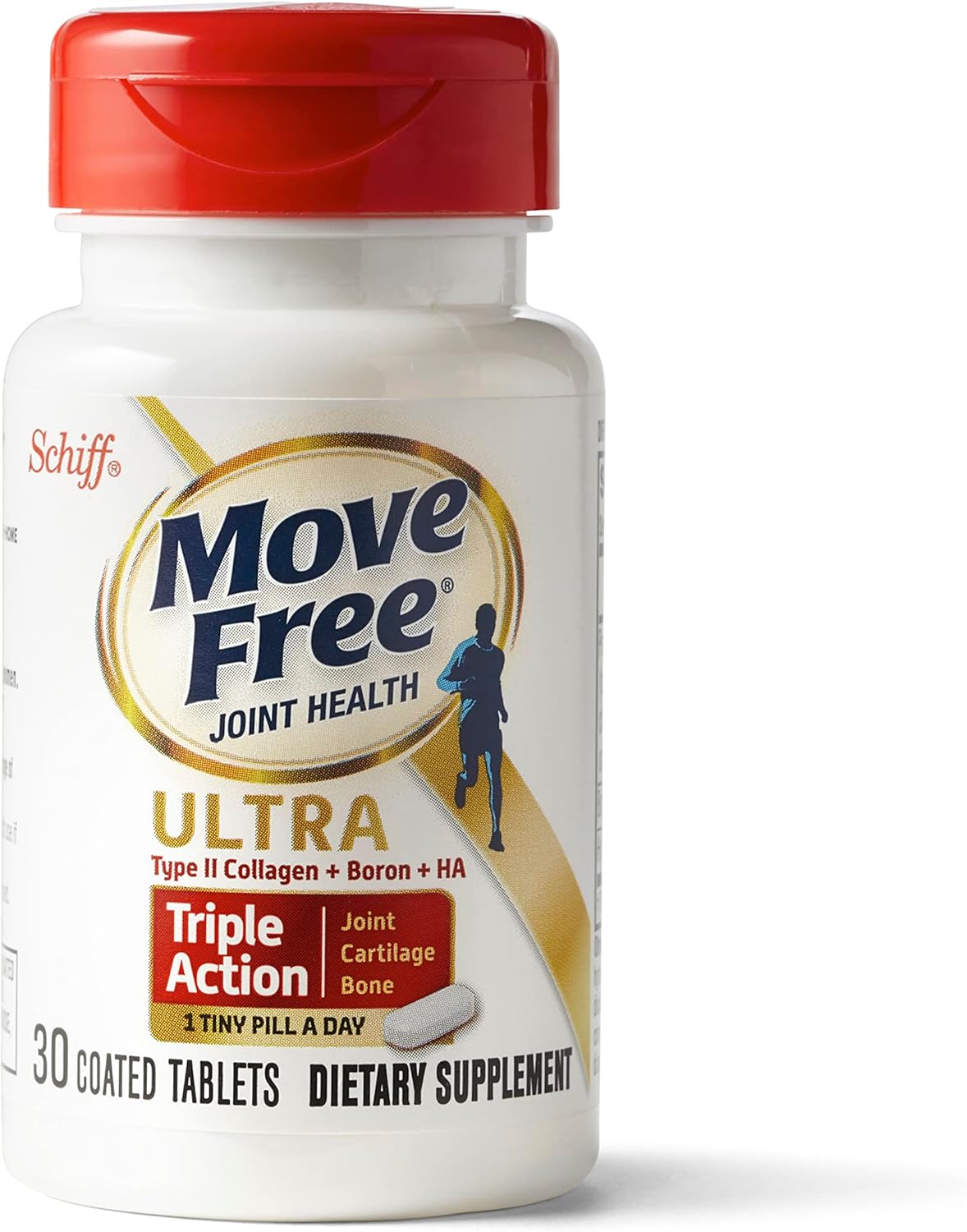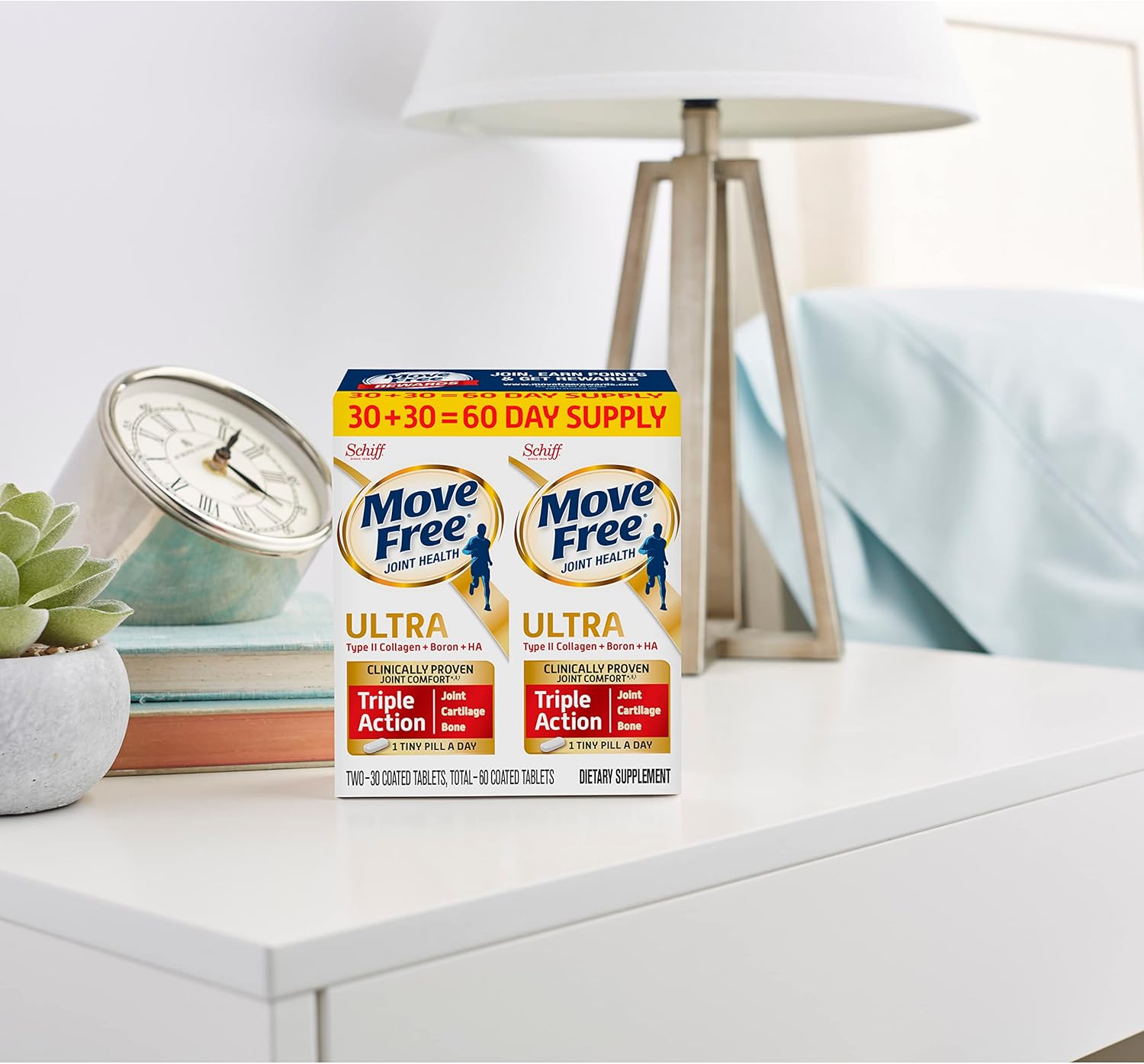 This unique joint support supplement contains Type II Collagen, Boron and Hyaluronic Acid to help preserve & maintain healthy cartilage, as well as help support healthy bones.* Move Free Ultra Triple Action is clinically proven to deliver better joint comfort that improves over time.*‡¹ Our proprietary joint health blend contains Type II Collagen, the same protein found in healthy cartilage. Type II Collagen pills work with your immune system to help preserve & maintain cartilage.* Boron supports bone health by maintaining healthy levels of Vitamin D, Calcium and Magnesium.* Adults take one (1) tablet daily. 60 Day Supply! The MOVE FREE product family with clinically tested ingredients, offers a range of solutions to help you move better. Because when you MOVE FREE-ly, you live freely. *These statements have not been evaluated by the Food and Drug Administration. This product is not intended to diagnose, treat, cure or prevent any disease. ‡Undenatured Type II Collagen ¹Based on a 180-day clinical study comparing 40mg Type II Collagen to 1500 mg Glucosamine & 1200 mg Chondroitin (Lugo et al, Nutrition Journal, 2016).